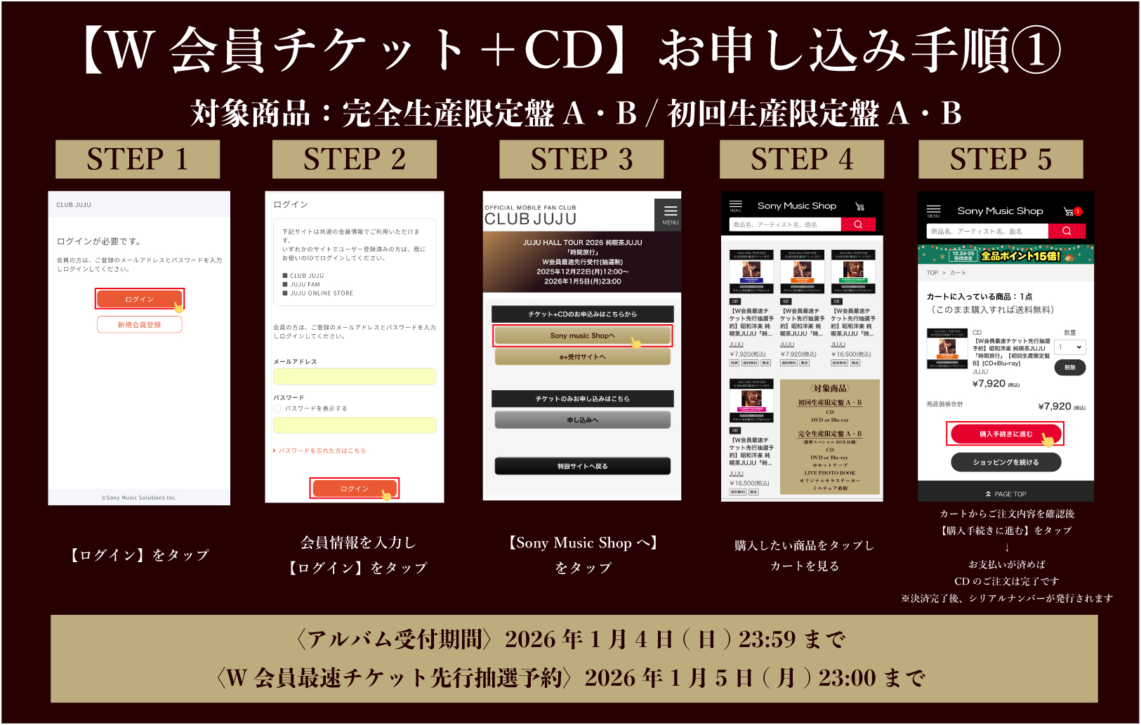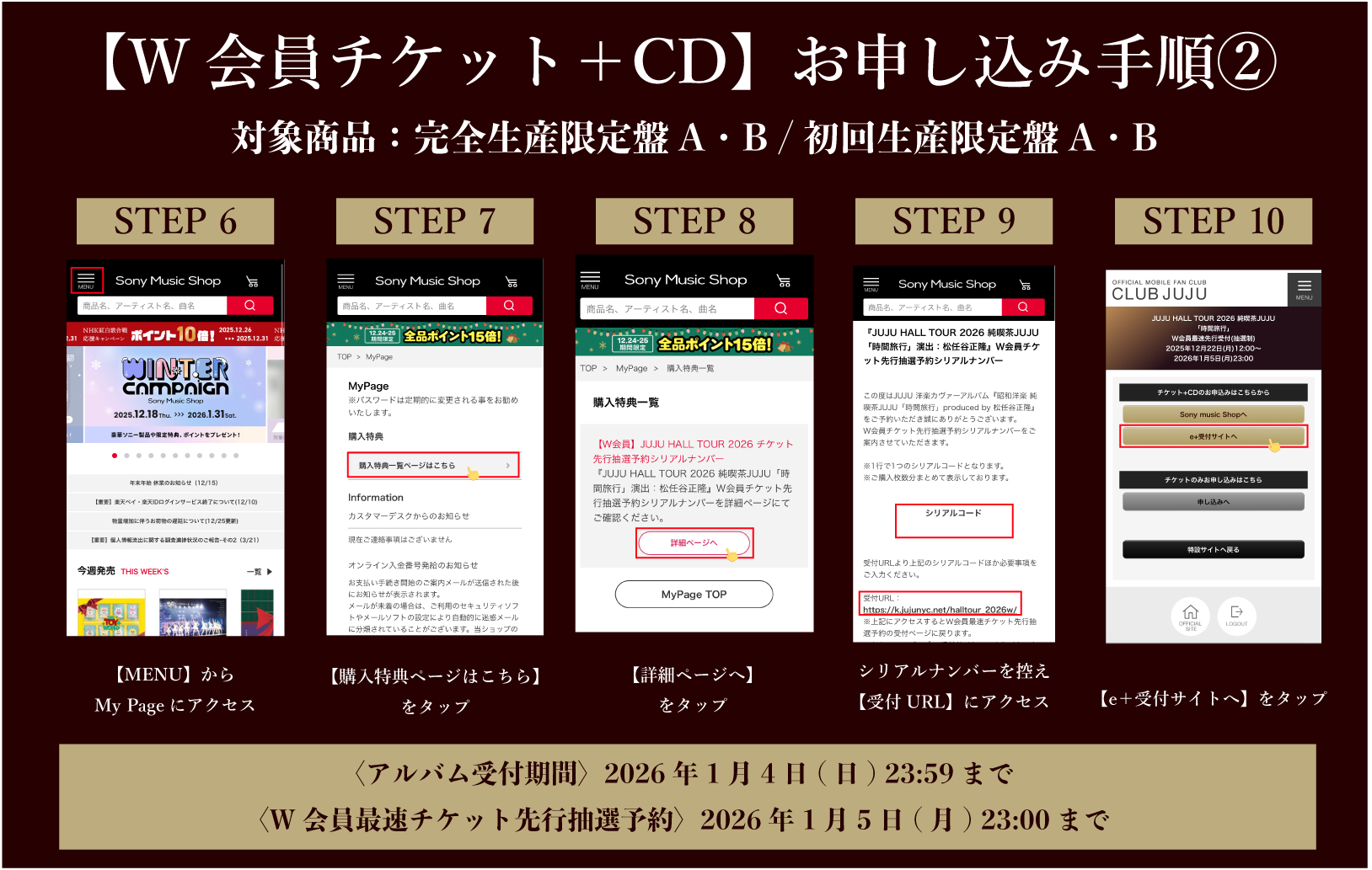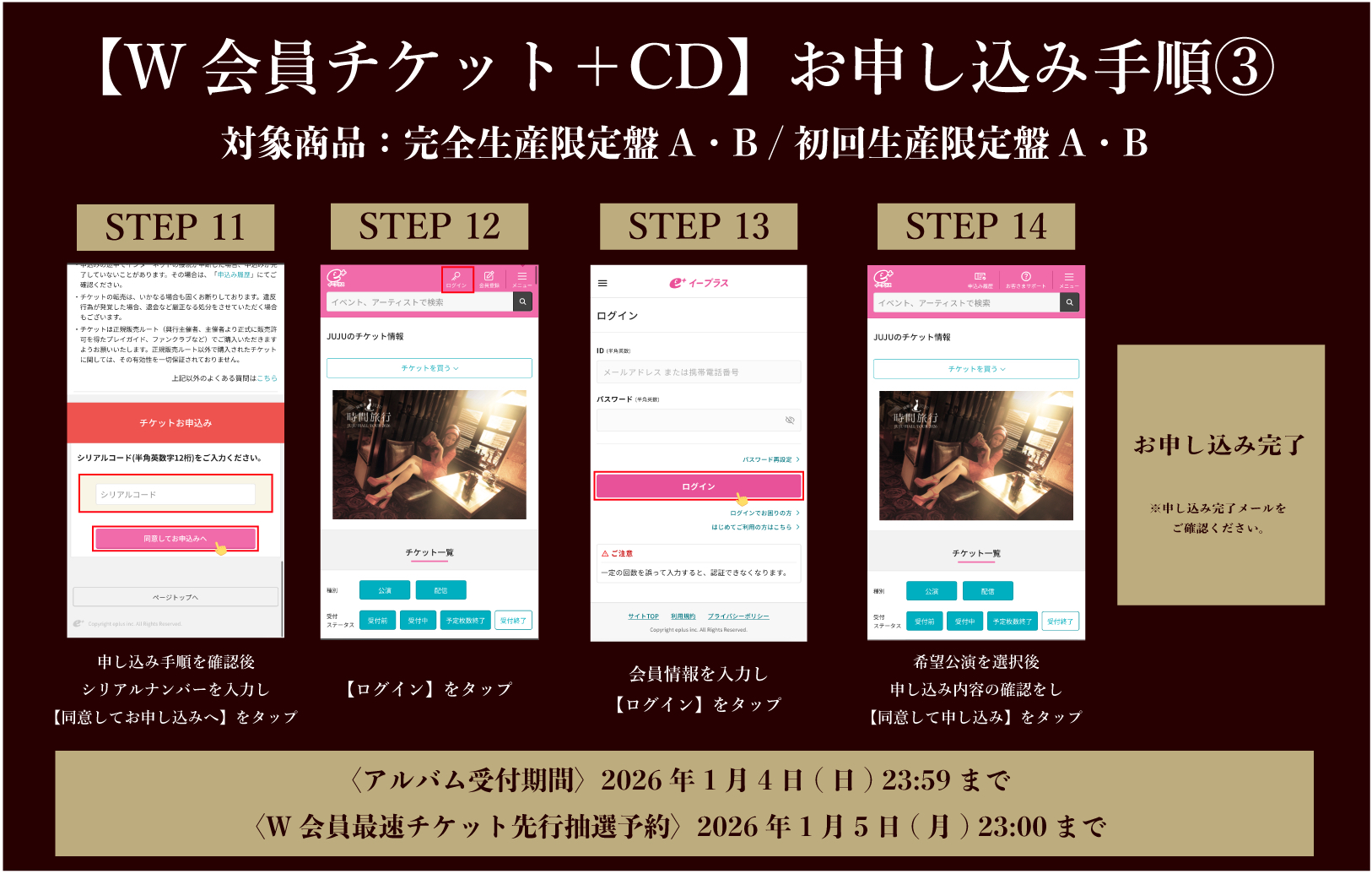 ※CDご購入時に発行された「JUJU FAMチケット先行抽選予約シリアルコード」をW会員チケット先行抽選予約期間に誤って使用された場合でも、今回のお申込み時にあらためてご使用いただけます。 お手元のシリアルコードが本受付対象であるか、Sony Music Shopマイページよりお確かめのうえお申込みください。